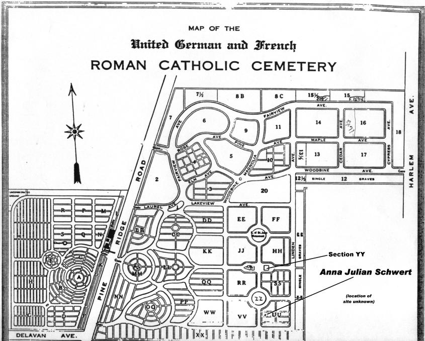 In this small area lies the unmarked grave of Anna Juliana Schwert, Lot 5, Section UU, Line 6, Grave 5, United German & French Cemetery (Pine Hill), Cheektowaga, NY. A map to this gravesite is available here.