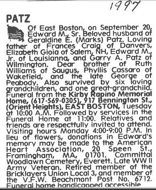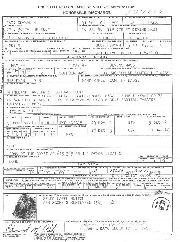Edward's military records indicate that he attended public school in Boston, Masschusetts, completing coursework through the 9th Grade. On April 27, 1941, Edward married Geraldine Edith Marks. Geraldine was born in 1921 in Boston, Masschusetts. She was the daughter of Clifton S. Marks (native of Blue Hill, Maine) and Frances (née Oliver) Marks (native of Phippsburg, Maine). Up until 1942, when his daughter Frances was born, Edward worked as a bricklayer's laborer. He then became a bricklayer, in order to earn more money for his new family. Edward was inducted into the U.S. Army in 1944. During World War II, he served as a rifleman in Company C 385th Regiment, where he fought in Europe (battles and campaigns included Rhineland, Ardennes, and Central Europe). Edward was honorably discharged from military service on January 16, 1946. Frances (née Patz) Craig writes of her parents: After the war, Mom and Dad bought my grandmother's house at 143 Falcon Street in East Boston, where he lived for the rest of his life. He was very seriously burned in an accident in his back yard, lighting a charcoal grill, in 1970, and spent three months in the isolation burn unit at Massachusetts General Hospital, receiving several skin grafts, and several more months recuperating at home. He often joked about donating his body for an exhibit at the Smithsonian, because of the scarring on his trunk, arms and legs. He was not able to tolerate the chemicals used in bricklaying after that, so became a maintenance worker at Revere Memorial Hospital in 1971. He retired on disability in, I think, 1979, after his first heart bypass. He and Mom loved to camp and had a trailer in a campground in Rochester, NH. They also loved to travel, and took to spending their winters in Florida after they retired. He was always the life of every party, and had a large store of awful jokes. His greatest joy was his family, and he loved nothing more than holding his grandchildren and great-grandson in his lap and making them laugh. He had at least two heart attacks in 1986-7 and a second bypass in 1987, and suffered from congestive heart failure until his death in 1997. Edward died on September 20, 1997. He is interred in a plot adjacent to his parents at Woodlawn Cemetery, Everett, Massachusetts. The following is with reference to the award to Edward Martin Patz of the Combat Infantry Badge. This badge is usually awarded to a service man who faced personal combat/jeopardy in action during a war. The account is written by his daughter Frances (née Patz) Craig: "Dad was wounded by shrapnel (WW II), what he called a "Million Dollar Wound" in the shoulder. It didn't hit anything vital, but did cause stiffness enough to qualify him for a disabled vet abatement on his real estate taxes. (He knew about but never took advantage of that abatement until he was not able to work as a brickie any longer after his burn accident in 1970.) The Combat Infantry Award could have been for his service at the Battle of the Bulge? I know he fought there. I remember the scar quite well, a nasty looking puckered dent in the front of his shoulder and a surgical scar in the back where they removed the piece of shrapnel." This Military Service Record for Edward records both this badge, and his award of the Purple Heart medal. |