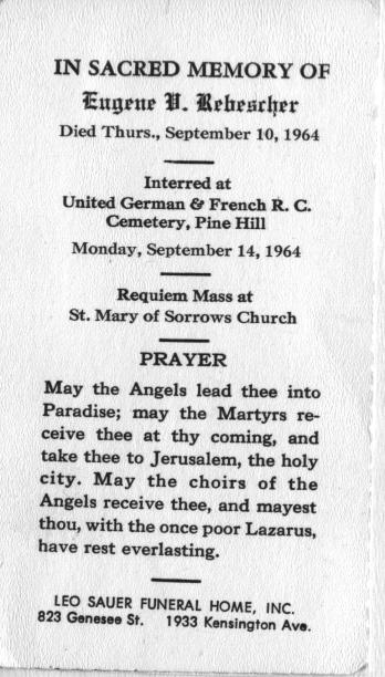 Eugene stayed in the family construction business until about 1947, when he moved his family to 1429 Burns Road, Derby, N.Y. At that time, he went to work for the Federal Portland Cement Company. While in Derby he raised Pedigree Golden Retrievers, and at one time he had nine of them. In 1957 Eugene moved his family back to the Buffalo area both because of his declining health and because they would be closer to the hospitals and family. He had several heart attacks by this time. The children would go with different family members while Eugene was in and out of the hospitals and recovering during his illness. The family lived on 89 Roehrer Street in the home that had been Rose’s parents, and Eugene worked in Rochester, N.Y., at a branch of the company he had worked for in Derby. It was called Rochester-Portland Cement Company, and Eugene was the Director of Technical Engineering in a facility the company had built so he could be closer to home and the hospitals. While working for them he would travel in the area giving seminars on the business. On Thursday, September 10, 1964, in Corning, N.Y., at the Corning Glass Company, as he was giving a seminar on concrete he suffered a moving embolism that went to his brain. He died instantly at the seminar. At the time Eugene's youngest child, John, was only 4 years old, and life became rough for Rose and the children. She purchased a house in West Seneca, NY, and rented out the upper half. But the tenants made it rough on Rose, and she had to ask them to move. At this time some of the children were grown and on their own. Louise (née Brendel) and Gay Moran, Rose’s sister and brother-in-law, offered for her and young John to move into their home, which they did. Rose was a very prim and proper lady. Never saying a bad word about others. She died on December 31, 1985, in Saint Petersburg, Pinellas County, Florida. Both Eugene and Rose are interred in Lot 22, Sec. 5, United German & French Cemetery (Pine Hill), Cheektowaga, NY. Text by Judith C. (née Rebescher) Glose, daughter of Eugene and Rose Rebescher. |