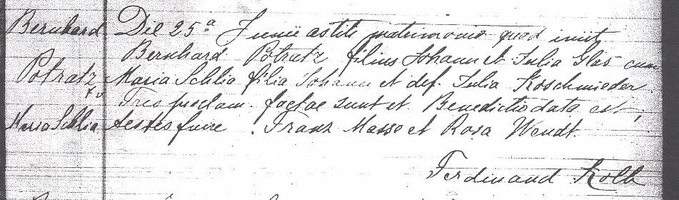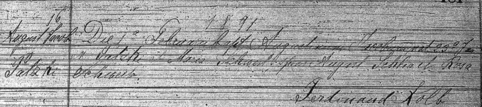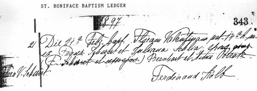 Francisca Schwertfeger was born On August 24, 1856, in Mittel-Golmkau, south of Danzig, West Prussia. The village is today Golębiewo-Średnie, Poland. Francisca was a daughter of Carl and Veronica (née Modrzejewska) Schwertfeger. Francisca was baptized as "Francisca Rosalia Schwerdfeger" on August 31, 1856. Witnesses were Johann Philipowski and Caroline Modrzejewska.