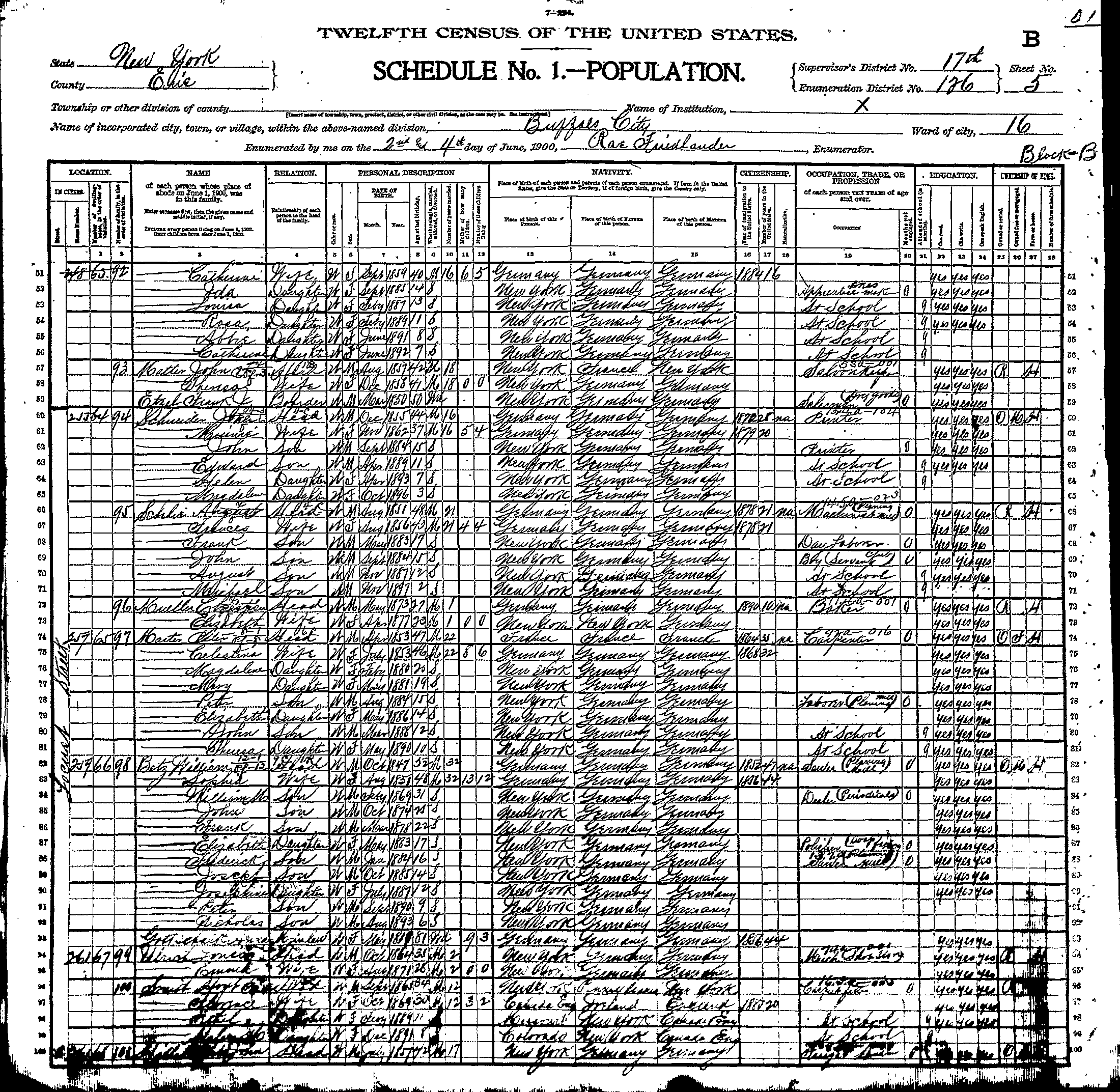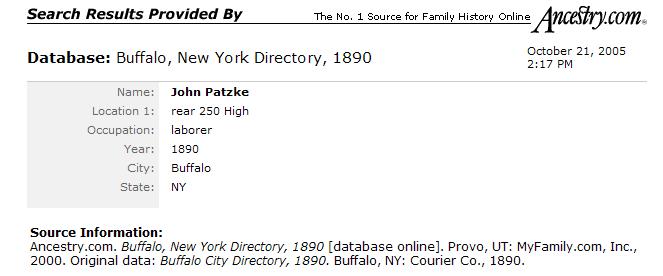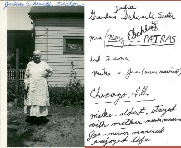 On May 12, 1878 at Kladau, West Prussia, Francisca married August J. Schlia. August was born in Lagschau on August 20, 1851. He was the son of Jacob and Anna (née Potrotz) Schlyia (note many variants for surname spellings of these families). The Catholic church ledgers of Kladau show that August was baptized as "August Michael Schlyia" on August 31, 1851. According to John Penberthy (son of Rita [née Schleer] Penberthy and great grandson of August and Francisca), August later in the Prussian army. He lost part of his hand or fingers in battle. On November 5, 1880 in Lagschau, Francisca gave birth to a daughter, Anna Susanna Schlia. With their infant daughter, Francisca and August emigrated to the United States. They departed Hamburg, Germany on March 25, 1881 aboard the S.S. Hamburg. The Hamburg departure records list them as: Traveling with them were Francisca's brother Franz (= "Frank") Carl Schwertfeger, his wife Julianne (= "Julia") (née Schlia) Schwertfeger (a sister to August) and their infant son Johann (= "John"). At Liverpool, England, both familes transferred to the S.S. Canada, arriving in New York City on April 13, 1881. A mis-transcribed passenger manifest lists the Schlias as follows: The same passenger manifest also mistakenly lists the Schwertfegers as "Schwerfegor." The two families settled in Buffalo, New York --- in a German neighborhood known as "The Fruitbelt" due to several of its streets being named after fruit trees. Francisca and August anglicized their names: Francisca became "Frances (née Schwert) Schlee." August became "August J. Schlee." Labels on a photograph imply that yet another sibling, "Mary" Schlia / Schlee, emigrated to the United States; however records of the marriage (June 25, 1890, St. Boniface R.C. Church, Buffalo) of Mary to Bernhart (= "Bernhard") Potratz demonstrate that the maiden name of Mary's mother was "Koschmieder," while the maiden name of the mother for August and Julianna was "Potrotzka." Thus Mary was likely not a direct sibling of August and Julianna. (See further information, below). According to the Buffalo City Directory, August and Francisca resided in 1890 at 248 High Street (white building) -- apparently next door to Johann (John) and Maria (Mary) (née Schwertfeger) Patzke/Patz), who resided at 250 High Street. During their later years, August and Francisca resided at 255 Locust Street (now a vacant lot) in Buffalo, New York. They raised six children. Despite the implications of the 1900 Census, where it states that four of the four existing children still survived, there is an 1895 baptismal record for Jacob Michaëlew Schlia -- apparently a child who did not survive until the 1900 census. August died of pneumonia on June 5, 1923, at the age of 71 (the cemetery records state that he died on June 6th). Francisca died of pneumonia on May 17, 1936, at the age of 79. At the time of her death, she resided at 375 Florida Street in Buffalo (the street address on her interment record is in error). Both Francisca and August are interred in Lot 112, Sec. 8C, United German & French Cemetery (Pine Hill) in Cheektowaga, NY.