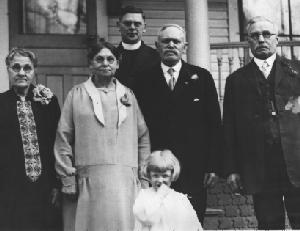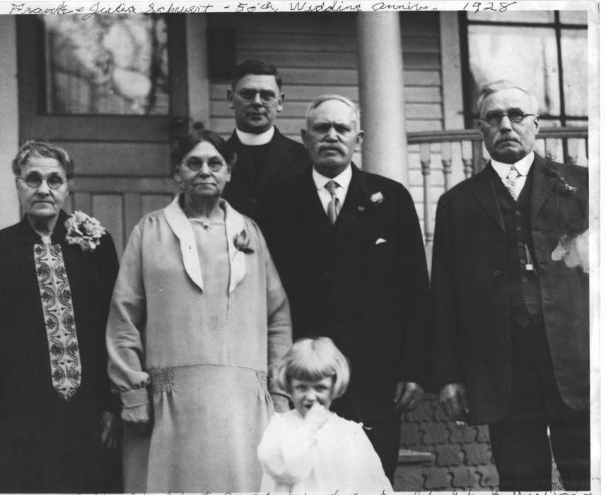 Left-to-right: Francisca (née Schwertfeger/Schwert) Schlia/Schlee, Julianna (née Schlia) Schwertfeger/Schwert, Rev. Johann (John) Bernard Schwertfeger/Schwert, Grace Elizabeth Mary, Franz Carl Schwertfeger/Schwert, and Johann (John) Schwertfeger/Schwert. This photo appeared in the Buffalo Evening News, which reported "Mr. and Mrs. Frank Schwert of 115 Nevada Street celebrated their golden wedding at which their son, the Rev. John B. Schwert of St. James Church, officiated. The original witnesses, Mr. Schwert's brother John, and his sister, Mrs. Frances Schlee, were present." (1928)