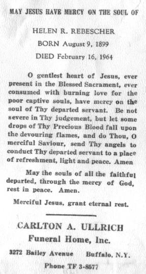 | Helen Rose Rebescher was born on August 9, 1899, in Buffalo, New York. She was baptized by Fr. Ferdinand Kolb of Saint Boniface R.C. Church, 124 Locust Street, Buffalo, on August 13, 1899. Her sponsors were Franz (= "Frank") and Julia (née Schlia / Schlee) Schwertfeger / Schwert.