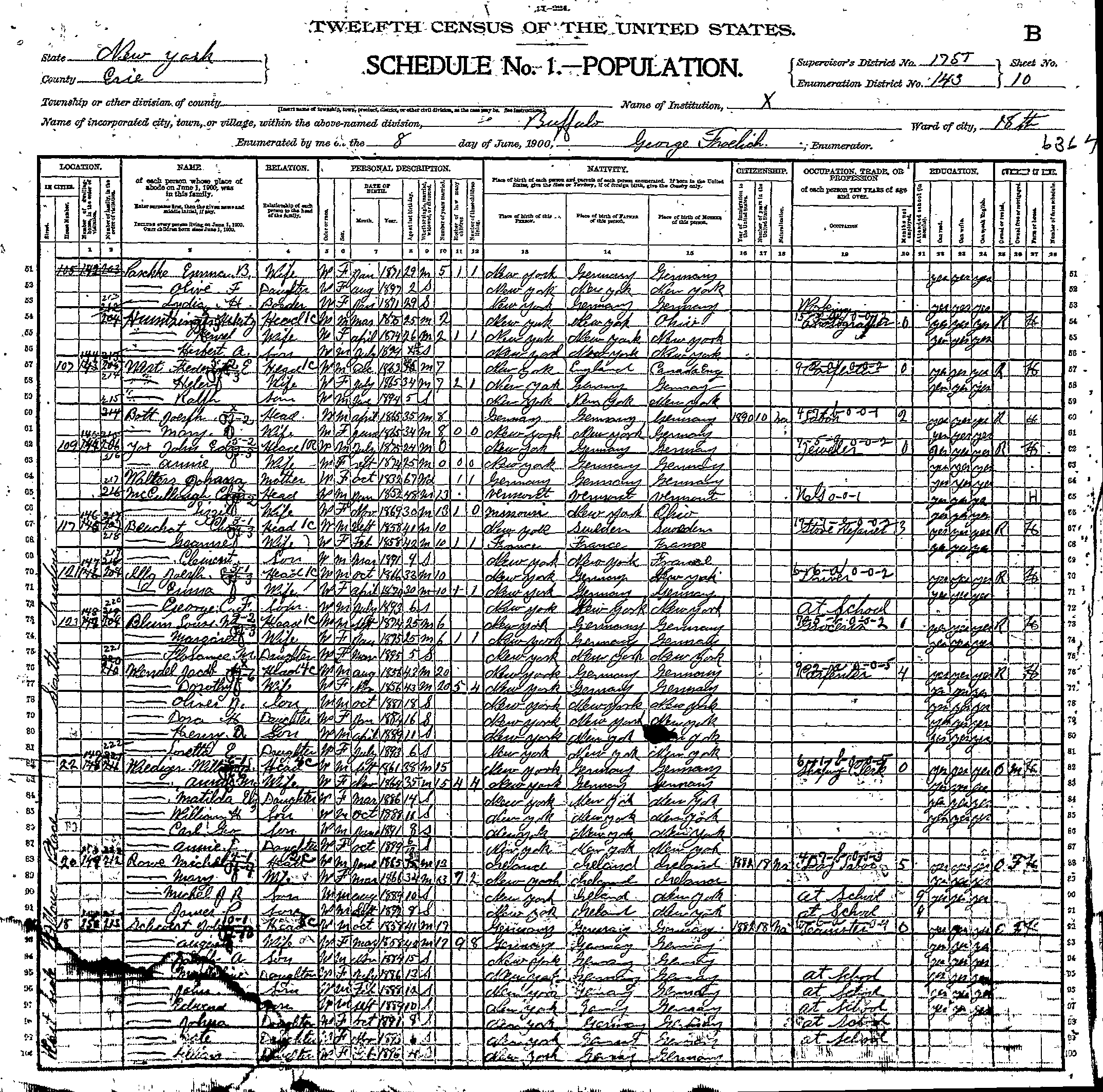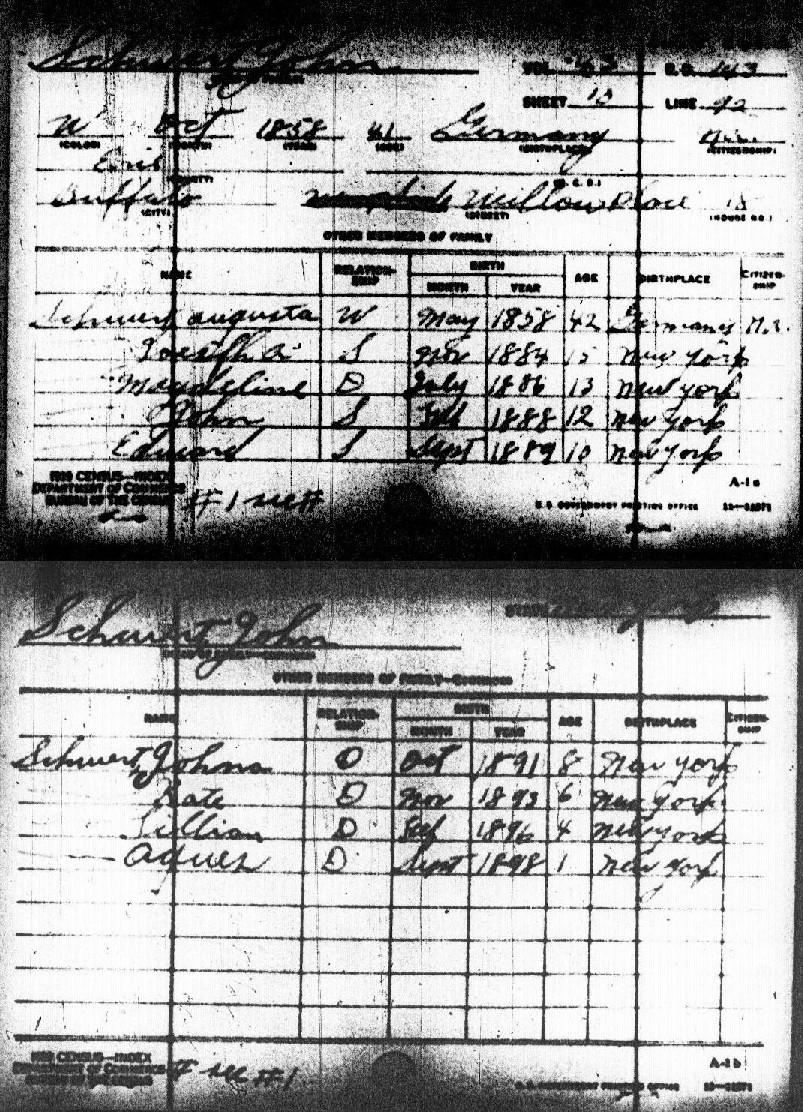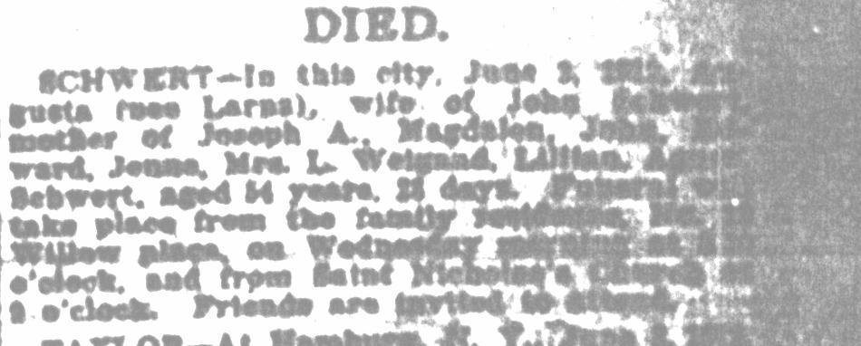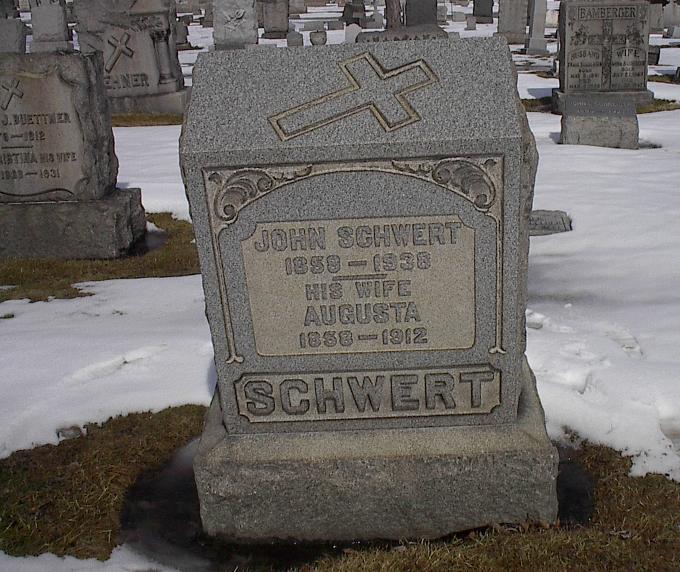 In early 1882, we know that Johann was residing with his parents in the tiny manorial village of Lagschau, Kr. Danziger Höhe, West Prussia. Johann departed to join his siblings Franz and Francisca (née Schwertfeger) Schlia in the industrial city of Buffalo, New York. Johann first traveled to Hamburg, Germany, where he then boarded the steamship India on April 5, 1882. After his arrival in Buffalo, Johann Americanized his name to "John Schwert." On April 10, 1883, Johann married Augusta (probably originally Auguste) Lorenz at Saint Boniface R.C. Church, 124 Locust Street, in Buffalo. Augusta was the daughter of August and Julianna (née Malinowska) Lorenz from the tiny settlement of Klopschau, located south of Katzke, West Prussia. According to the 1900 U.S. Census, Augusta was born in May, 1858. After their marriage, the couple resided at 18 Willow Place in Buffalo. Johann and Augusta had at least three sons and six daughters. The 1890 City Directory for Buffalo gives Johann's profession as being a "laborer." The 1928 City Directory lists his profession as being an "elevator operator." Records provided by Geri Ellerbrock present the following on Johann's U.S. citizenship status: Augusta died on June 2, 1912, at the age of 54 years, 24 days, of complications due to gallstones (cholecystitis). Johann married Carrie (née Wright) Wittig, born in 1869. He became foster-father to her daughter, Grace. According to the 1900 Census, Carrie had been the wife of John Wittig; the Wittig family had resided at 54 Mulberry Street in Buffalo. Johann died on January 8, 1938. He is interred with Augusta in Lot 428, Section VV, United German & French Cemetery (Pine Hill), Cheektowaga, NY. Carrie Schwert-Wittig died at the age of 94 on August 30, 1964, of myocardial infarction. Carrie is interred with her daughter Grace M. (née Wittig) Acquard and Grace's husband Clarence W. Acquard (1890-1964) in Lot 339, Section I, Mount Calvary Cemetery (Pine Hill), Cheektowaga, NY.