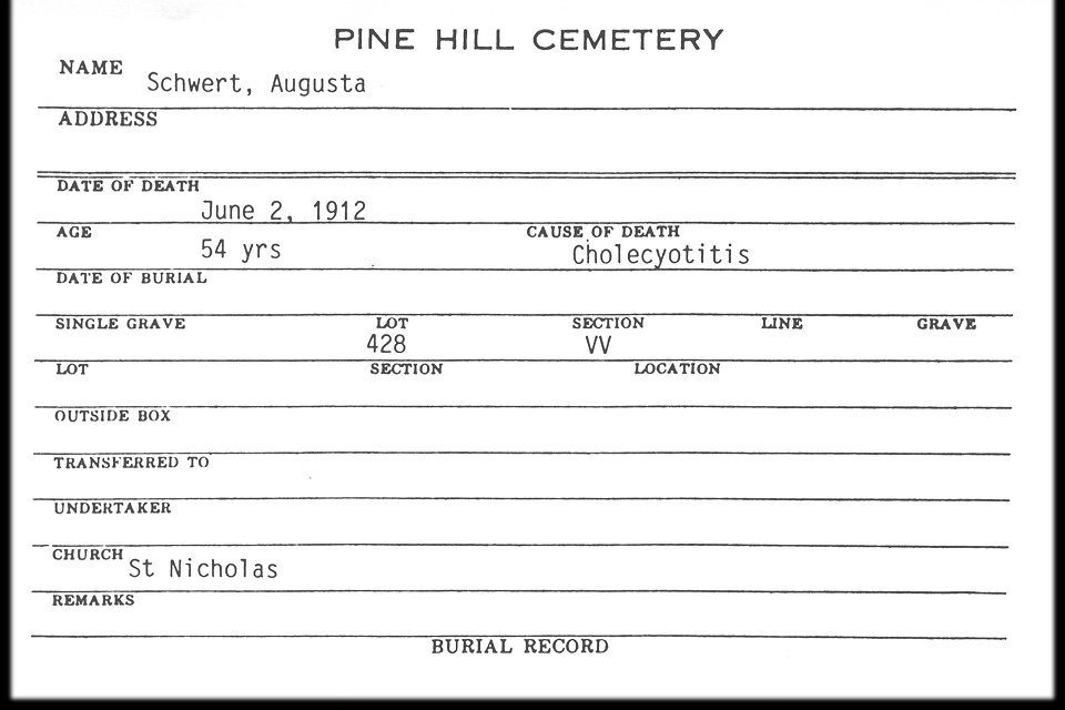 | Grave of Carrie Wittig-Schwert, Lot 339, Section I, Mount Calvary Cemetery (Pine Hill), Cheektowaga, NY.