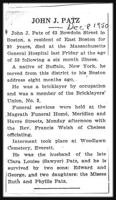 The following is paraphrased from the memories of Frances (née Patz) Craig, daughter of Edward Martin Patz, Sr., and granddaughter of John Joseph and Clara Louise (née Sawyer) Patz.