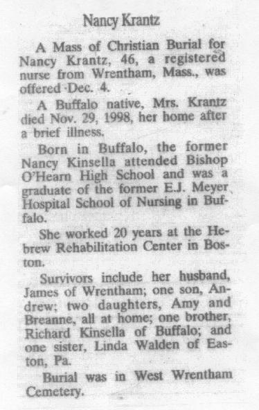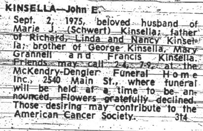Marie went to Mount Saint Joseph's High school in Buffalo (her uncle, Rev. John Schwert, paid her way). On June 24, 1944, Marie married John E. Kinsella. John died on September 2, 1975. Marie died on July 19, 1993. They are interred in the St Anne de Beaupre section of Mount Olivet Cemetery, Kenmore, NY. |